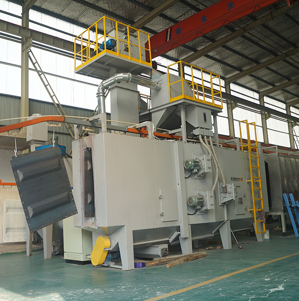 懸鏈通過式拋丸清理機(jī)設(shè)備,由拋丸清理室、拋丸器總成、丸料循環(huán)凈化系統(tǒng)(螺旋輸送器、提升機(jī)、分離器、彈丸控制系統(tǒng))、懸鏈輸送系統(tǒng)(客戶可自備)、檢修平臺(tái)、除塵系統(tǒng)、氣控系統(tǒng)、電氣控制系統(tǒng)等組成。